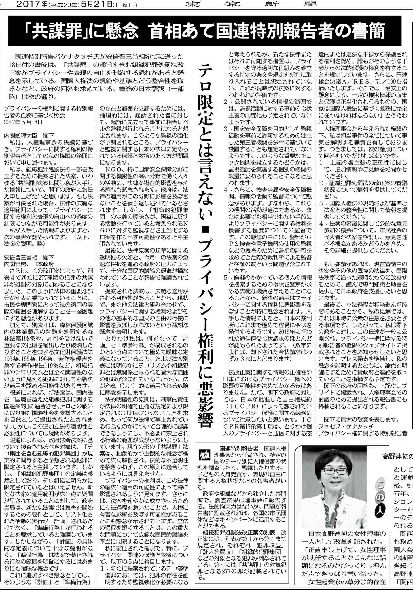 記事中では、共謀罪の権力による濫用や、表現の自由に対する憲法違反の攻撃との批判と併せ、著作権違反や森林の違法伐採まで含まれる法令のいい加減さが指摘されている。 後半は、国連人権理事会特別報告者のケナタッチ氏の懸念が大きなスペースを取って引用されている。 ブルームバーグ Bloomberg 見出しから「安倍、監視能力を増加する法案を推進」と名指しである。 本文でも「共謀罪は安倍の長年の野望である平和憲法の変更に道を開いた」と、政権の本質をばっさりと喝破。 そして後半は、やはり国連の懸念について大きく紹介している。 ドイチェ・ヴェレ Deutsche Welle こちらの見出しも「日本の共謀罪は民主主義に手錠をかける」と、法令の真の目的を突いている。 そして、抗議の市民の大きな写真。 また安倍の「オリンピックまで三年しかない」との発言を引用して、政府がオリンピック開催を政治利用していることに言及。 さらに、共謀罪によって277もの犯罪を「共謀」として起訴する権力を捜査当局に与える一方、法令はテロ対策と直接関係する内容がほとんどなく、キノコ狩り、切手偽造、デモでの座り込み、無許可の競輪などを含むデタラメなものであることを暴いている。 また共謀罪は、安倍の「連合軍に押し付けられた」とする憲法の書き直し策動に直結していることを明確に指摘し、さらに日弁連や国連からの批判も大きく取り上げている。 ガーディアン Guardian 見出しでは、「市民の自由に対する懸念に反し、野蛮な反テロ法成立」と表記。まさに野蛮としか言いようがない。 ガーディアンも、安倍政権がオリンピックを言い訳にしているものの、法令にはテロや組織犯罪とまったく関係ないものが多数含まれており、マンション建設反対の座り込みや、音楽のコピーなども対象となると指摘している。 またケナタッチ氏の懸念に対し「極端にバランスを欠いている」とする安倍政権の不誠実な対応も紹介されている。 アイリッシュ・タイムス Irish Times アイリッシュ・タイムスは、日本について「殺人は10万人に0.3で世界でも最も安全な国であり、大きなテロは20年以上発生していない」のに、なぜ共謀罪が今必要なのか疑問を呈しており、また日本政府がさっそくマンチェスターのテロ事件を口実としていると批判している。 記事の後半はケナタッチ氏の懸念と併せ、デヴィッド・キー氏による「メディアへの脅威の懸念」を紹介している。 ストレート・タイムス Strait Times 管理社会の先鋒であるシンガポールのエスタブリッシュ・メディアでさえ、抗議の市民の写真と併せ、共謀罪が著作権違反や森林の違法伐採などテロ対策と無関係なものを多数含んでいることを報じている。 ワシントン・ポスト Washington Post ワシントン・ポストの見出しも「懸念の高い反共謀法案を首相が先導」と、いきなり名指しである。 記事本文では共謀罪が改憲の動きと連動していることに触れ、中野晃一氏の「安倍の傲慢さと弱さを示すものだ」との発言を引用するとともに、可決へ向けての拙速な動きは籠池や加計の不正問題から関心をそらすものと断じている。 さて、国会での審議の中継すらまともに行わず、メディアとしての役割を放棄したNHKが、共謀罪成立当日の15日夕方、共謀罪で何が変わるのか詳細に解説する報道を行った。日本経済新聞も同様である。なぜ審議中にこうした解説を行わなかったのか憤るよりも、むしろ「共謀罪が成立してこうなったんだから、お前ら黙っていろ」との恫喝としか思えない。 しかし、こんなことで委縮し沈黙するわけにはいかない。既に私たちは海外報道に頼らざるを得ないところまで来ているのだ。そして私たちの未来は、まともな民主主義国家の運営を取り戻すことにしかないのである。 2017年5月現在国会で審議が続いている「組織的犯罪処罰法の一部を改正する法案」、いわゆる「共謀罪」に対して、国連人権理事会のプライバシー権特別報告者であるジョセフ・ケナタッチ氏から、日本政府に対して懸念の書簡が届けられた。 原文は国連人権理事会のWebサイトでPDFにて公開されている。 また弁護士の海渡雄一氏らのグループの努力により、早速日本語による全文翻訳も作成された。 なお、ケナタッチ氏による懸念のポイントは次の通り。